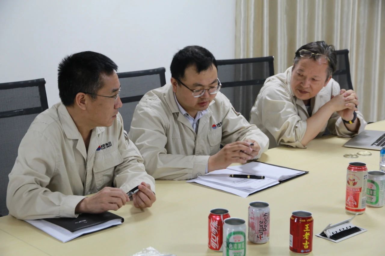 石磊(中)與技術專家探討罐體料技術質量問題