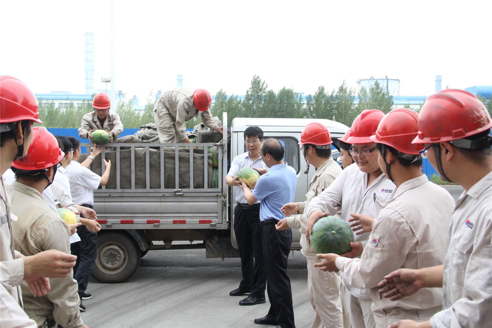 7月25日上午,受集團公司賀懷欽董事長委托,中孚實業總經理張松江帶隊,集團公司有關領導、機關各部門人員組成慰問組,先后到鋁業公司、銀湖鋁合金公司、博奧公司、電力公司、高精鋁公司、炭素公司、熱力公司等11個單位,帶去16000斤西瓜以及夏桑菊、藿香正氣水、風油精、清涼油等防暑降溫用品,看望、慰問奮戰在高溫崗位的一線員工,讓員工在酷暑中感受到舒心的涼意。