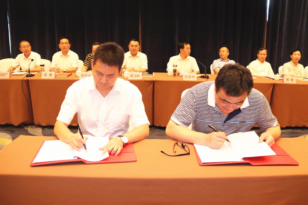 ▲廣元經開區黨工委副書記、管委會主任羅凌云與中南大學鄧運來教授簽訂中南大學(國家)技術轉移中心(廣元)分中心共建協議