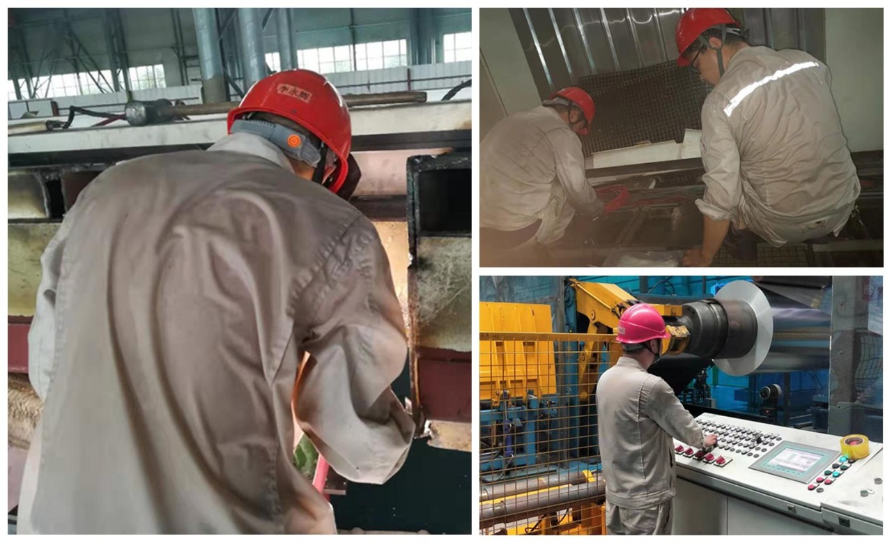 戰高溫斗酷暑,高溫天氣擋不住高精鋁一線員工的工作熱情,大家始終干勁十足。熱軋現場,為保障設備可靠運轉,檢修班組加班加點進行設備改造,消除設備缺陷。拉矯現場,受高溫蒸汽的影響,散熱機器附近溫度較高,呆在現場不到兩分鐘,衣服就像水里撈出來一樣,但員工不畏暑熱,在生產現場認真操作設備,一絲不茍地檢查下機料卷。軋機現場,為了不漏檢任何一個質量問題,年輕的員工目不轉睛地盯著高速軋制的卷材,臉上的汗珠滴答不停,但他們顧不得休息,始終堅守在軋機旁邊,一個卷材完成軋制,另一個卷材又進行同樣的操作,現場緊張又忙碌。