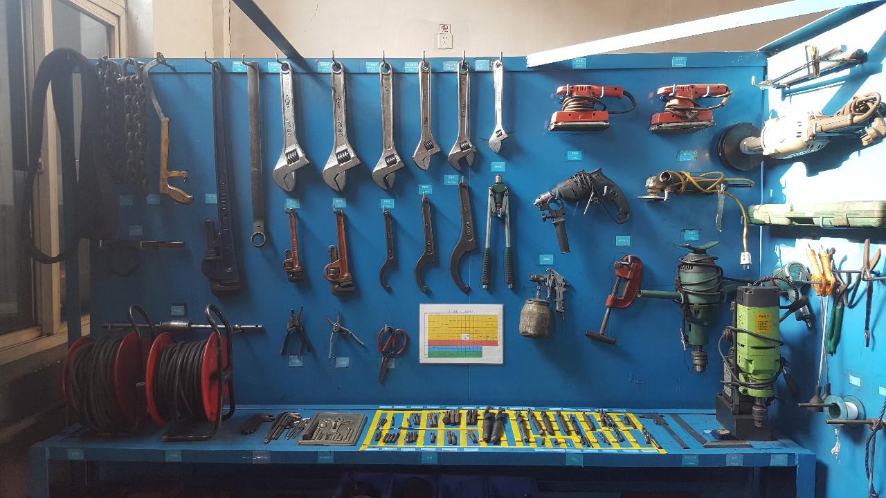 發動機組裝現場,整齊排列著活塞、欄桿、活塞環等發動機備件以及各種安裝工具和發動機翻轉臺架。