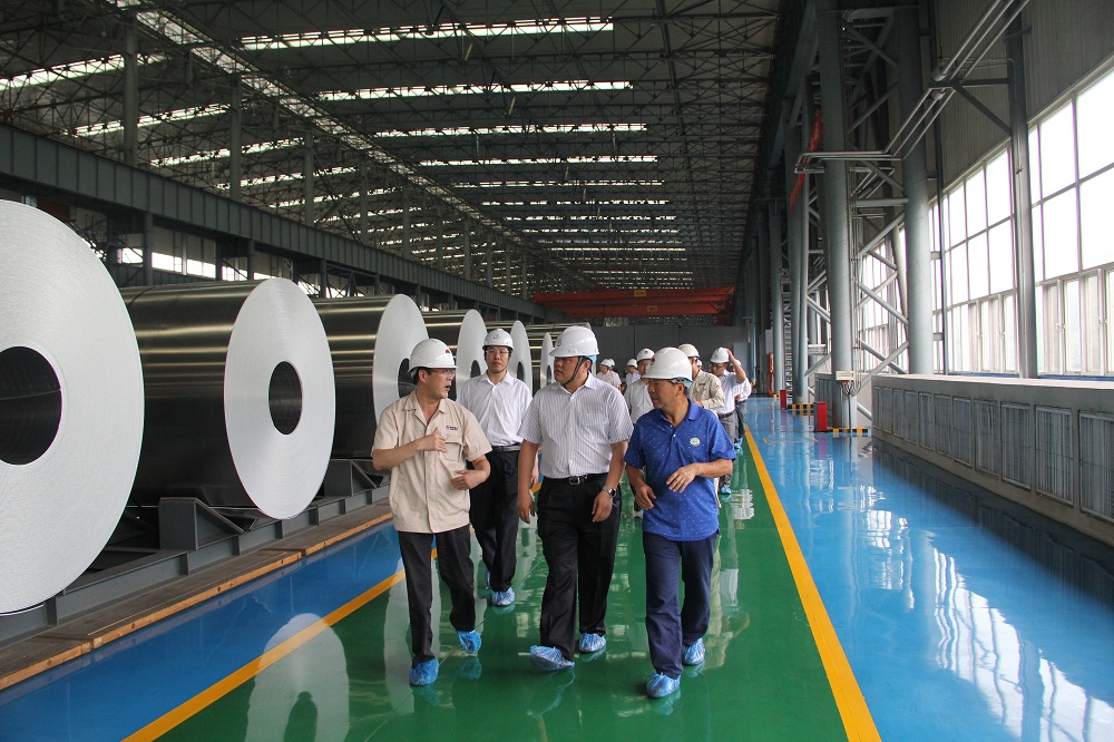 在集團(tuán)公司張洪恩董事長及有關(guān)領(lǐng)導(dǎo)的陪同下,中國銀行河南省分行領(lǐng)導(dǎo)金瑜銘一行頂著炎炎烈日,深入生產(chǎn)一線,先后參觀了電力公司、鋁業(yè)公司400KA鋁電解生產(chǎn)線。隨后,銀行領(lǐng)導(dǎo)重點參觀了高性能鋁合金特種鋁材項目生產(chǎn)及建設(shè)現(xiàn)場。中孚高精鋁公司負(fù)責(zé)人向銀行領(lǐng)導(dǎo)簡要介紹了生產(chǎn)工藝流程、產(chǎn)品質(zhì)量及市場開拓情況。金瑜銘一行興致勃勃地參觀了镕鑄、熱軋、冷軋的完整工序,或駐足觀看,或即興提問,或相互交流。當(dāng)看到銀光閃閃的合金板錠時,他們?nèi)滩蛔≥p輕撫摸,對企業(yè)整體轉(zhuǎn)型成果表示由衷的贊嘆。