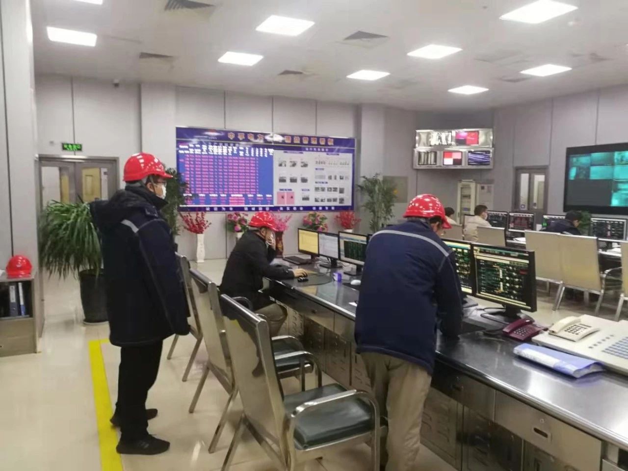 王政(左一)在集控室巡視防控情況